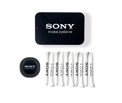 Quatro Metal Pokerchip Tin packed loose with 10 white 70mm tees printed up to 3 colours on the shank & 1 x NEW Quatro Metal Poker chip with 26mm black nickel square removable full colour resin dome ball marker. Tin is digitally printed on the lid, up to full colour
